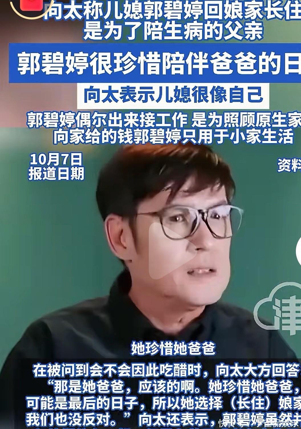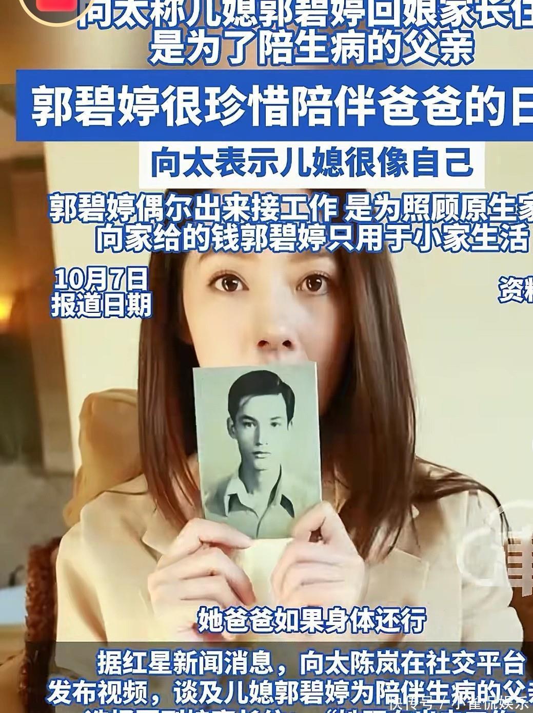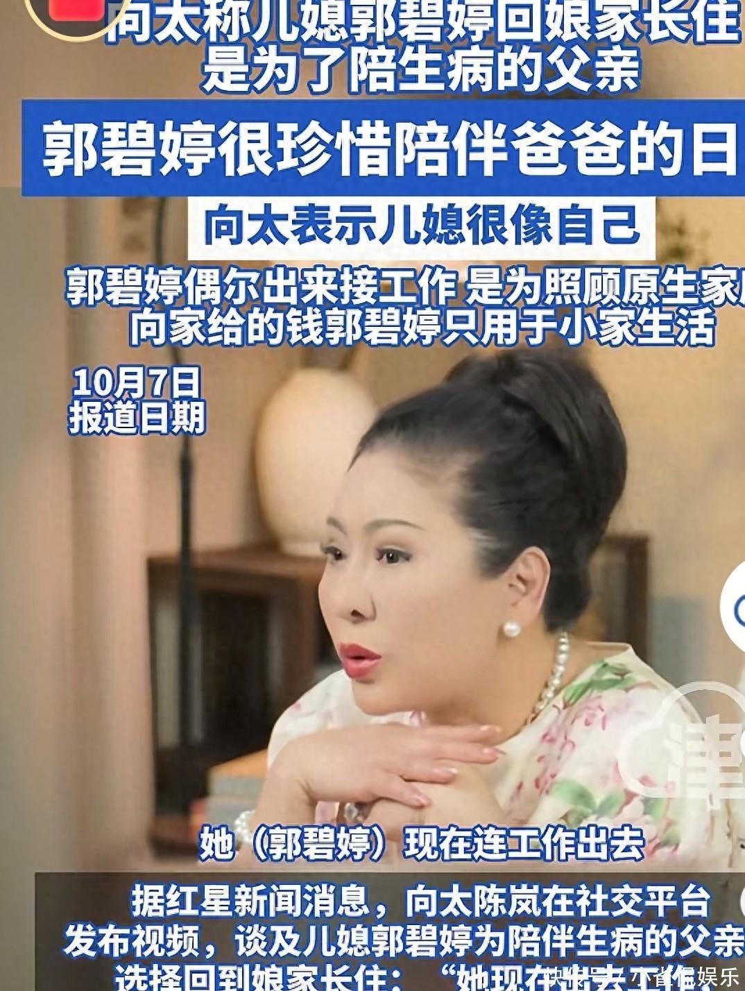 向太在最近的直播中表示,郭碧婷近几年都回娘家长住,目的是为了陪伴生病的父亲。郭碧婷很珍惜和爸爸在一起的日子,之前上综艺节目时就能看出来,父亲把她抚养长大,她很感激父亲的养育之恩。